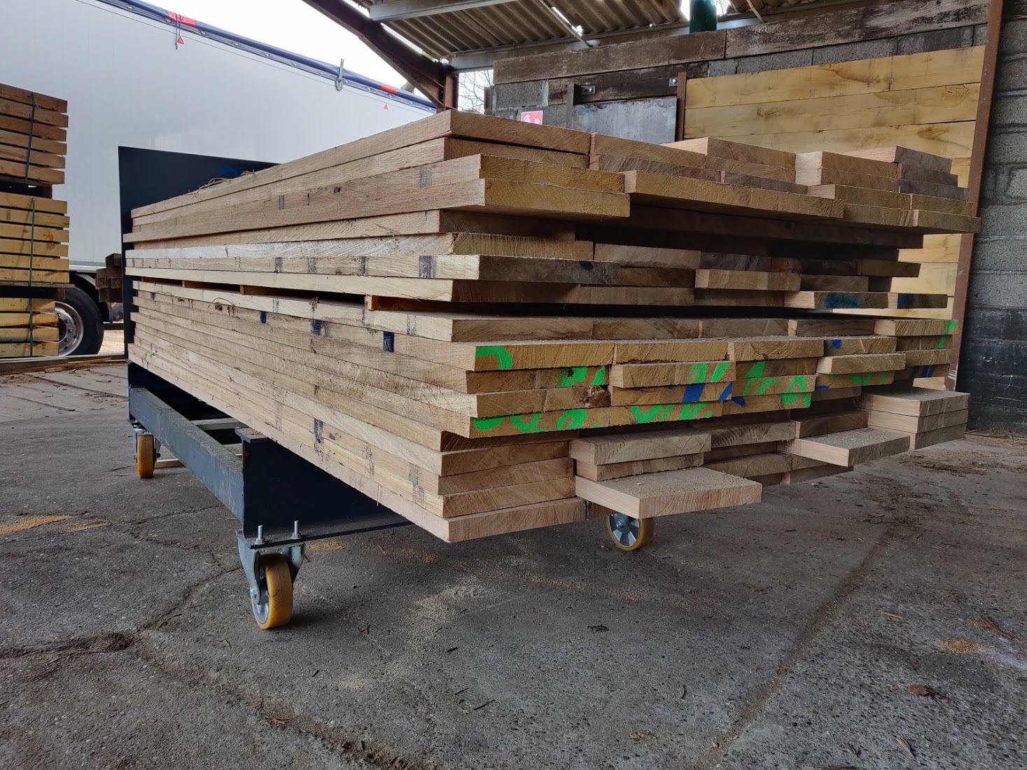 Nous sommes spécialisés dans la production d’avivés 27 mm d’épaisseur et en largeurs fixes jusque 3.0 m de long. Nous vendons aux professionnels: parqueteurs, paysagistes et tonneliers.